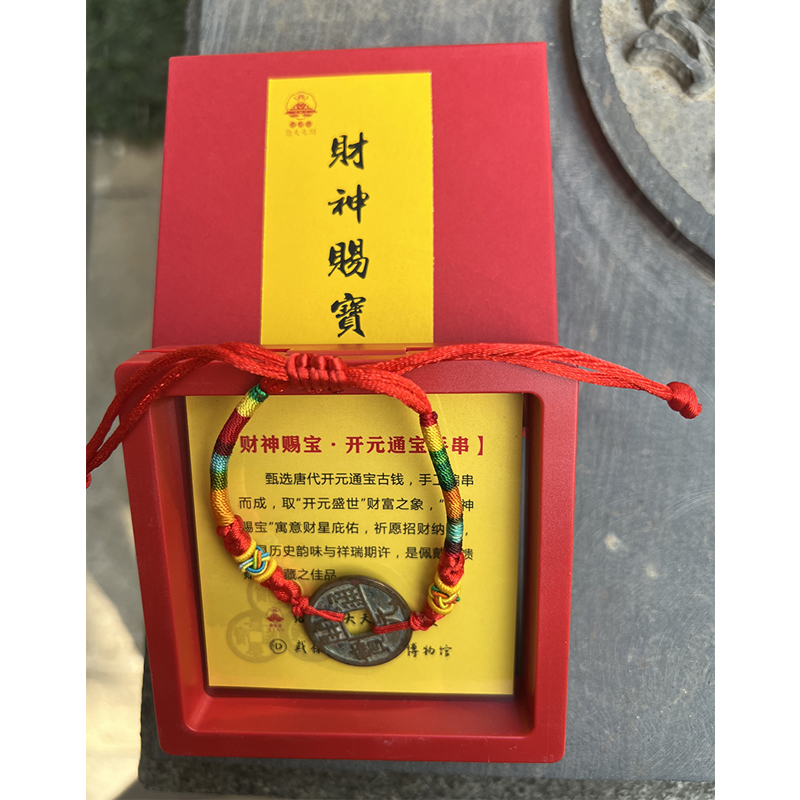 精选唐代开元通宝古钱,手工编串而成,借“开元盛世”财富之象,“财神赐宝”寓意财星庇佑,祈愿招财纳福,暗合财缘广聚,祈愿招财纳福,兼具历史韵味与祥瑞期许,是佩戴、馈赠、收藏之佳品